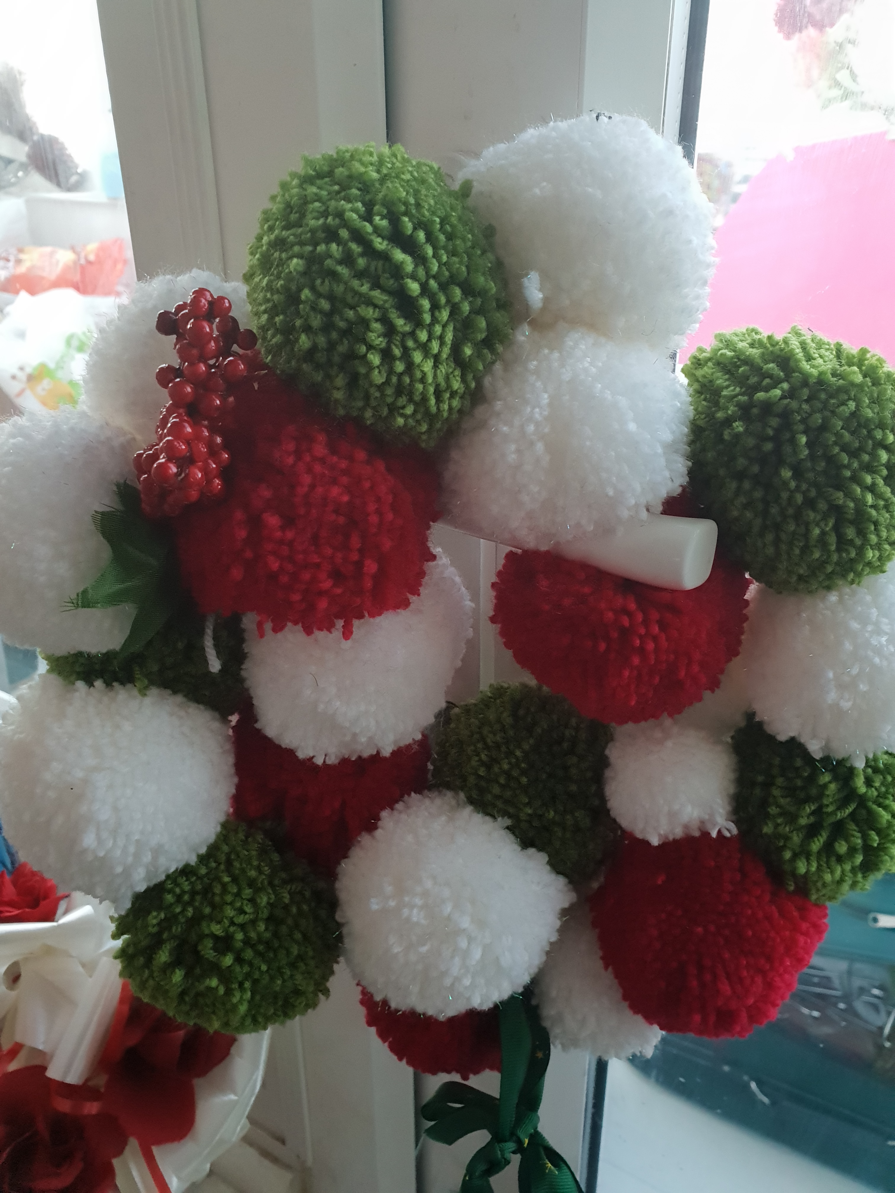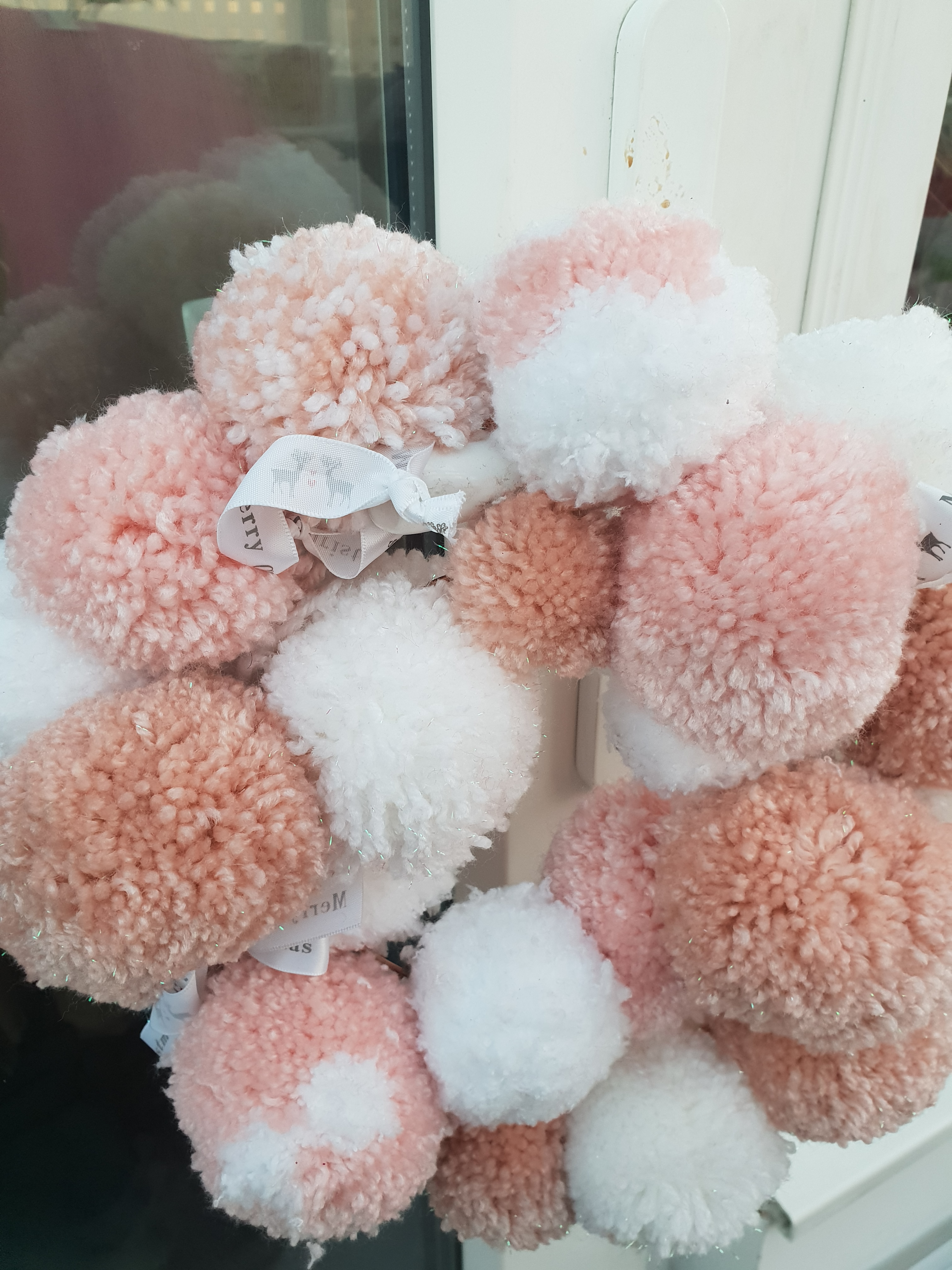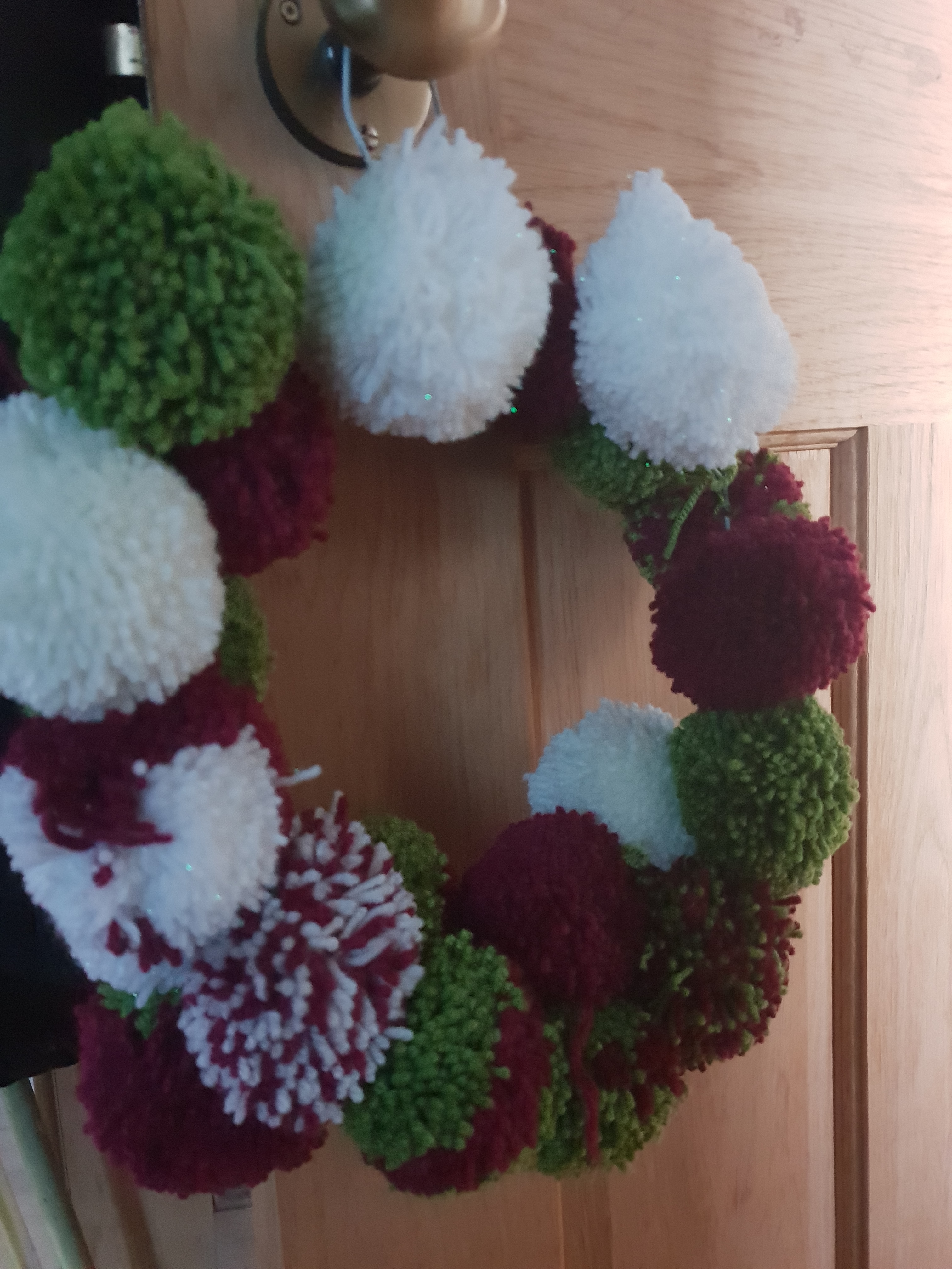 I bought a pom pom maker last year and it quickly became addictive. Every night whilst watching tv I’d make 3 or 4 in these Christmas colours hoping to make them into keyrings. Until I discovered pom pom wreaths on Pinterest.